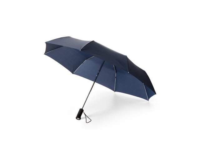 Guarda-chuva dobrável 39000, em Poliéster. Dobrável em 3 secções e com lanterna na pega (pilhas inclusas). Fornecido em bolsa.