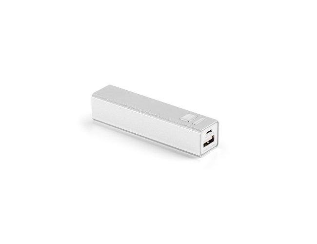 Bateria portátil em alumínio. Bateria de lítio com capacidade de 2.200 mAh, tempo de vida ≥ 500 ciclos e com entrada/saída 5V/1A. Incluso cabo USB / micro USB para carregar a bateria. 95 x 23 x 22 mm.