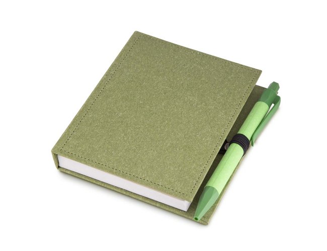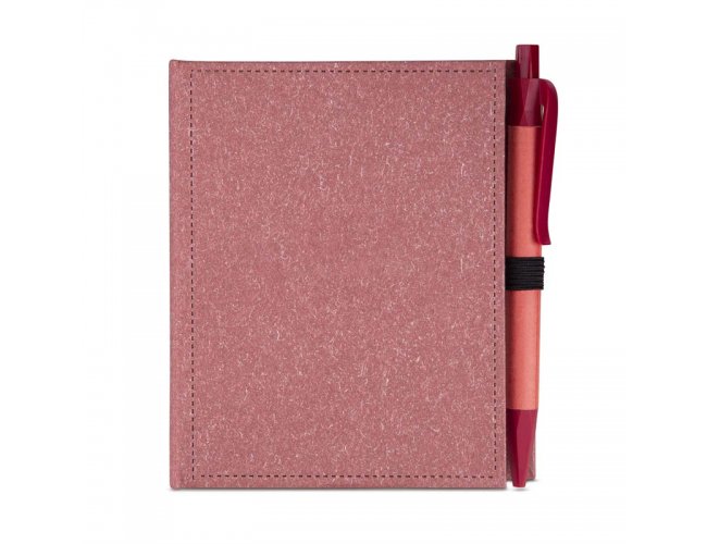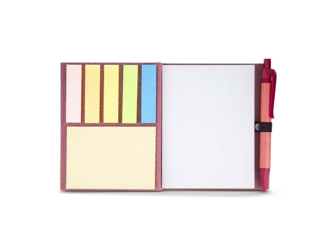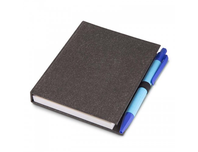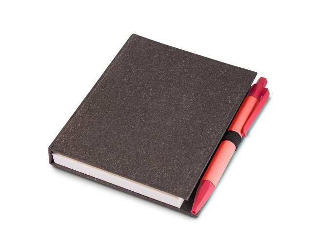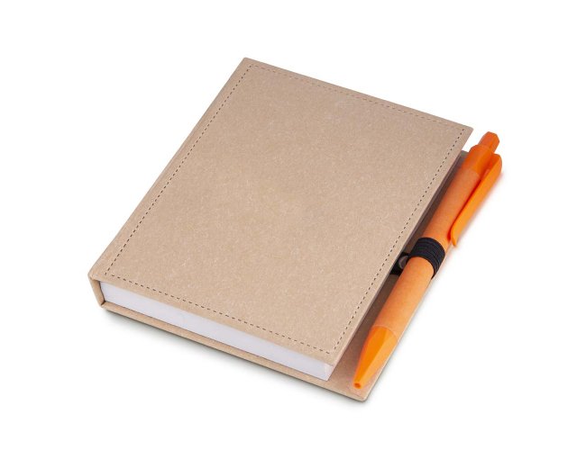 Bloco de anotações em papelão reciclado com capa dura, miolo com 100 folhas, sticky notes e miolo sem pauta na cor branca.
