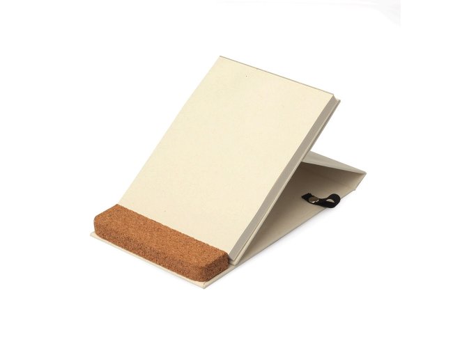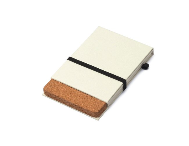 Bloco de notas produzido com papel de caixa de leite com capa dura, com 80 folhas, com papel em 80 (g/m2). Com cortiça no verso, elástico na cor preta e porta caneta.