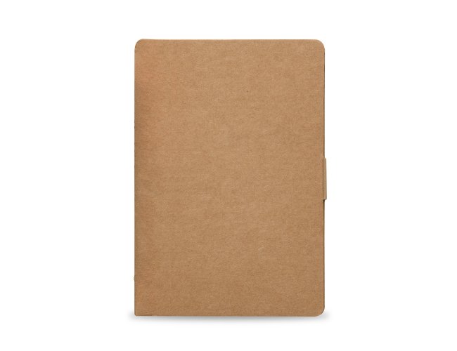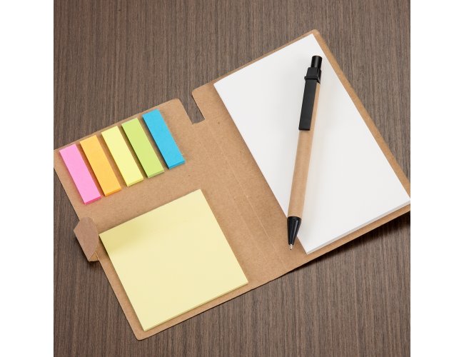 Bloco de anotações ecológico, material em kraft. Possui uma trava na própria capa, cinco blocos autoadesivos coloridos com aproximadamente 25 folhinhas , bloco autoadesivo amarelo com aproximadamente 25 folhas e bloco grande com aproximadamente 70 folhas. OBS.: IMAGEM MERAMENTE ILUSTRATIVA, não acompanha caneta!