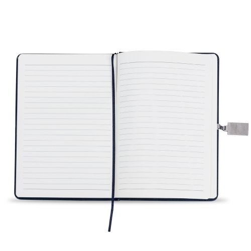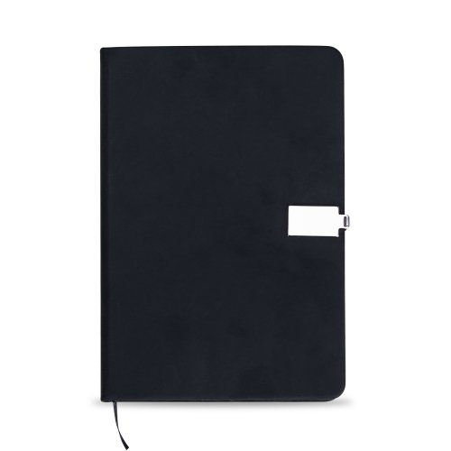 Bloco de anotações estilo moleskine emborrachado com fecho metálico imãtizado. Possui aproximadamente 96 folhas amarelas pautadas e marca página de cetim.