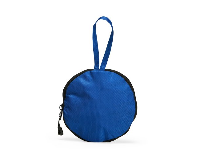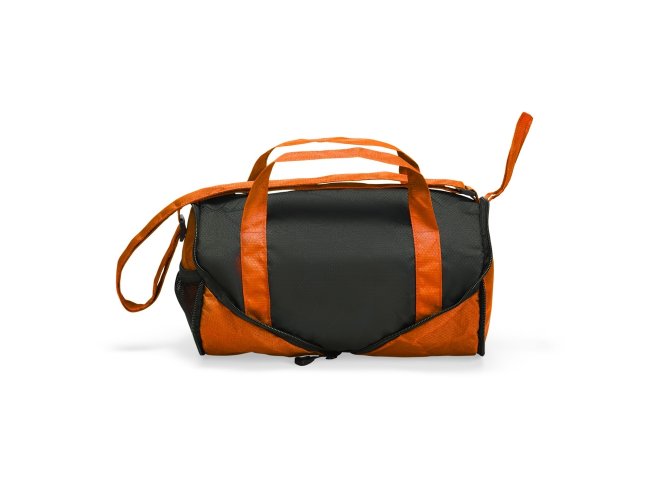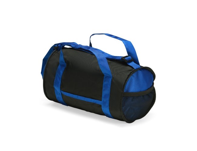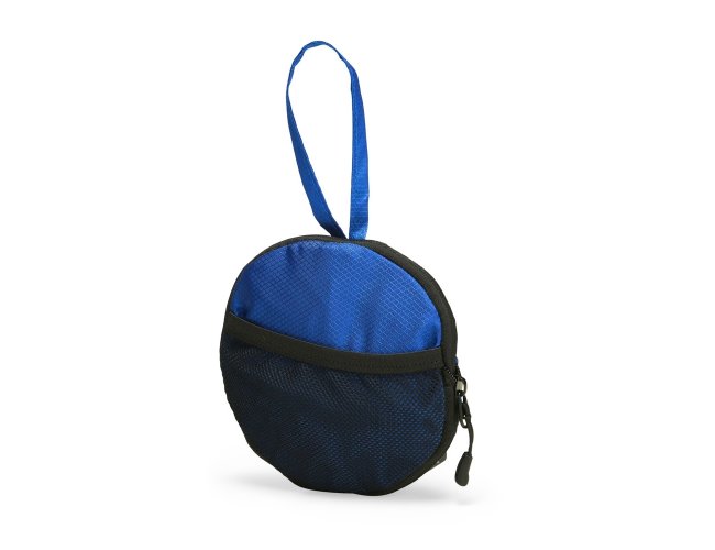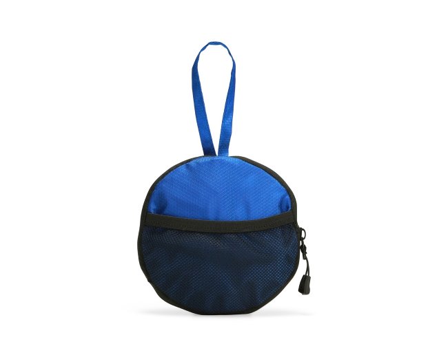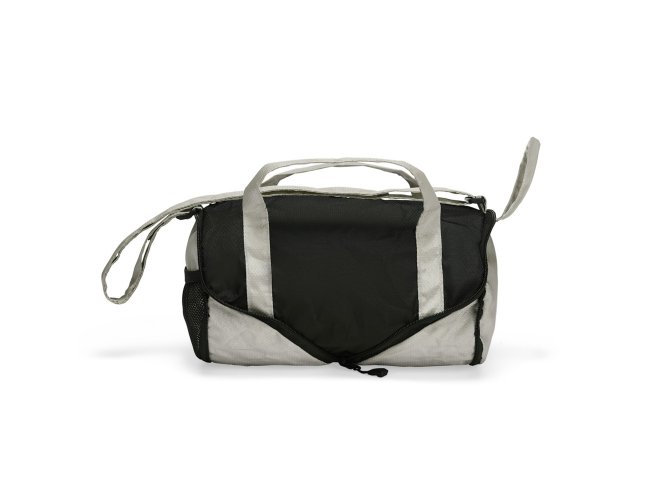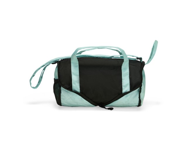 Bolsa esportiva em poliéster 420D resistente à água, com fechamento em zíper e capacidade de 6 litros. Quando dobrada, mantém formato arredondado com bolso telado e uma alça de mão para transporte.