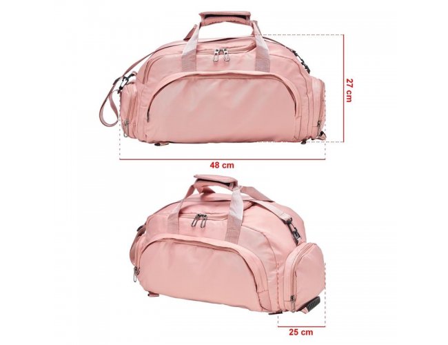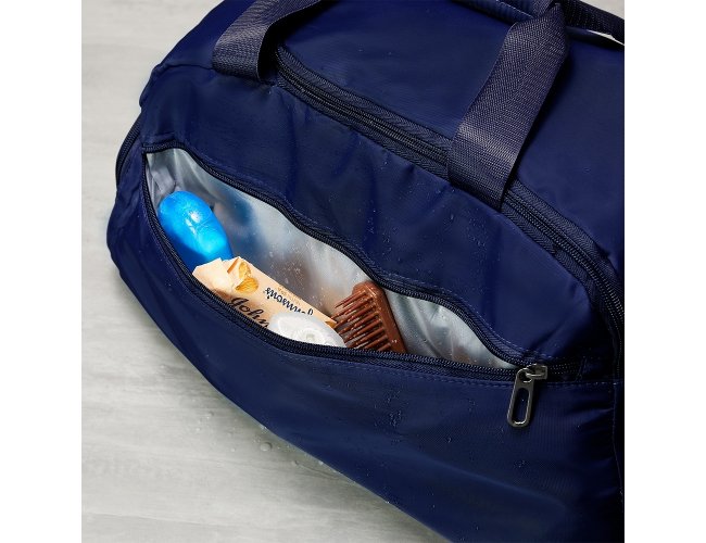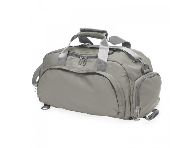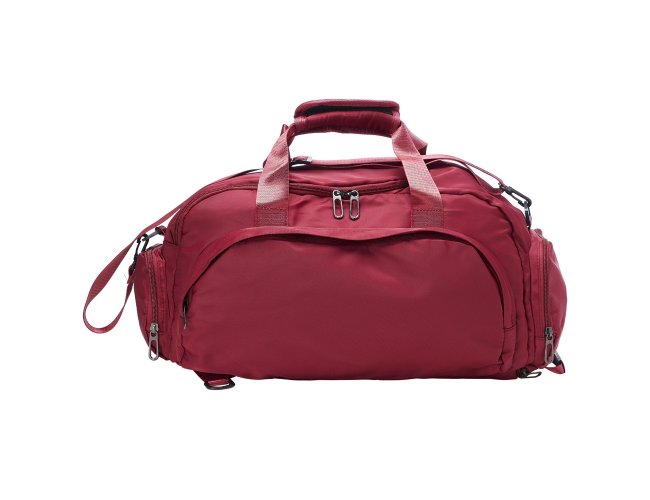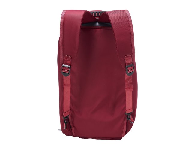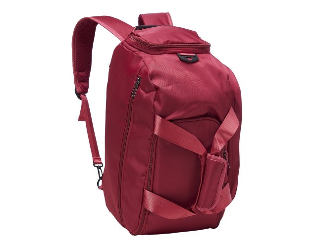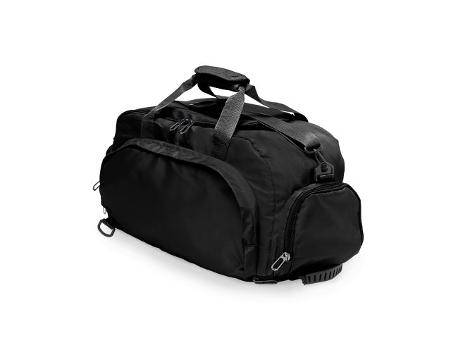 Bolsa esportiva de 32 litros em poliéster resistente à água com cinco compartimentos, sendo três deles exclusivos para tênis, itens molhados e armazenamento das alças de costas. Com alça transversal removível e alça de mãos com suporte de juntura, a bolsa contém alças para as costas ocultas no compartimento inferior, podendo ser transportada como mochila.