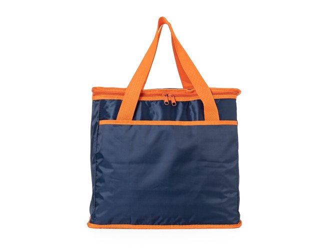 Bolsa térmica de poliéster com capacidade de 33 litros, contém área interna com revestimento térmico aluminizado, bolso frontal externo e alças de mãos para transporte.