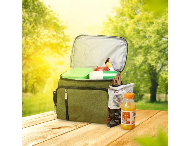 Bolsa térmica de poliéster com três compartimentos, capacidade de 9 litros. A bolsa possui revestimento térmico em PEVA atóxico com costura soldada (não vaza), alça de mão, bolsos laterais telados e acompanha alça transversal.