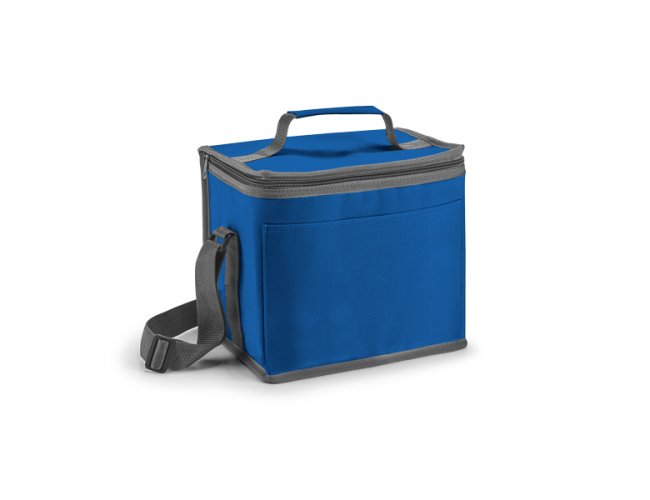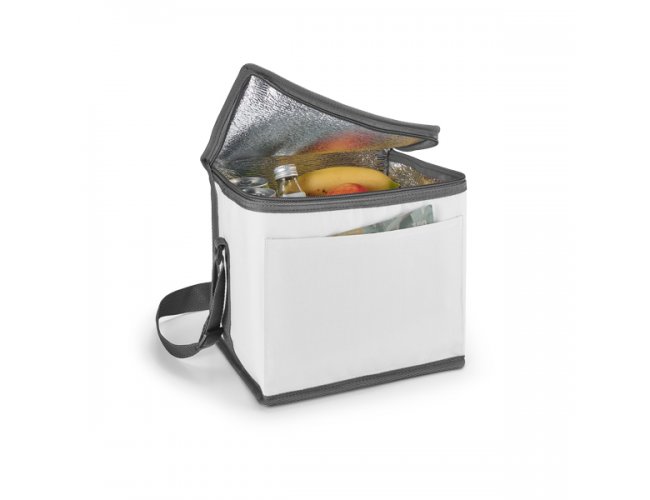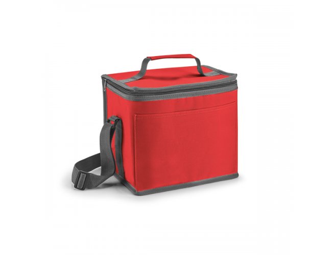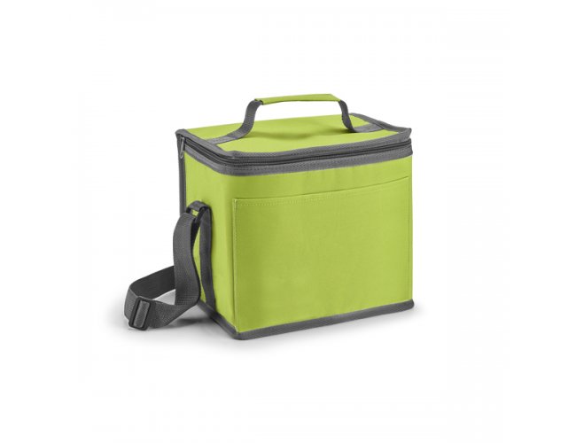 Bolsa térmica 98418 Personalizada com a sua logomarca. 600D. Com alça ajustável em webbing e bolso frontal. Food grade.