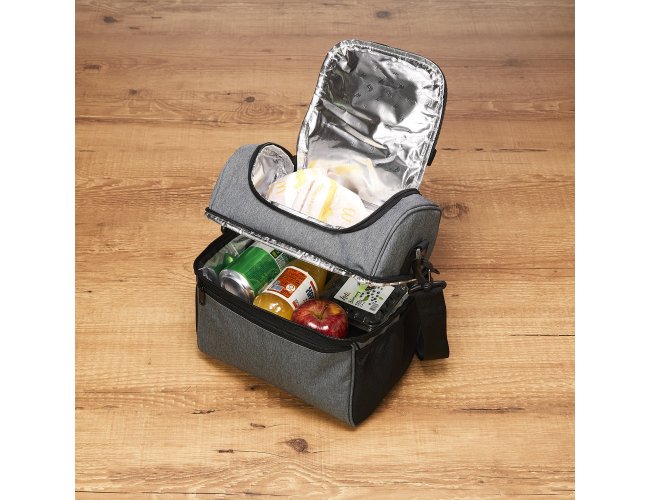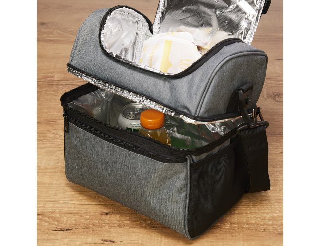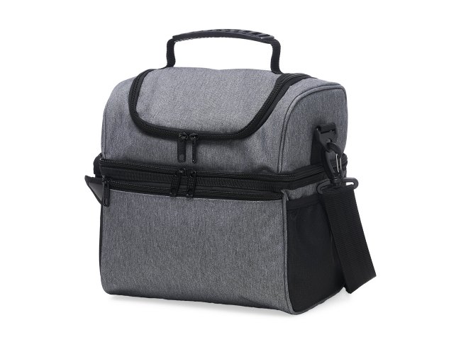 Bolsa térmica dupla de nylon com três compartimentos, capacidade de 16 litros. Contém dois compartimentos térmicos isolados, sendo o principal com costura soldada (não vaza). A bolsa possui alça de mão com pegador plástico, bolsos laterais em malha e acompanha alça transversal.