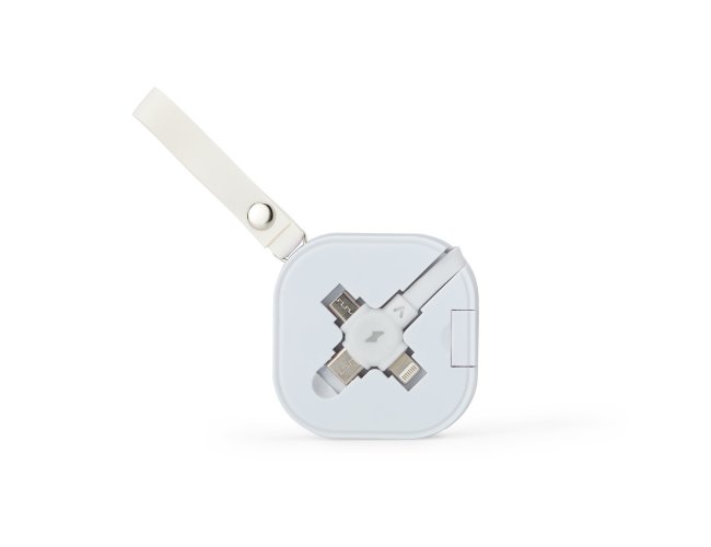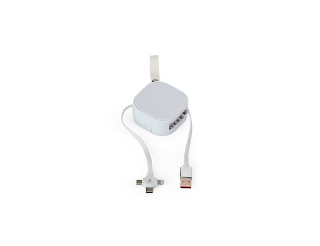 Cabo USB retrátil com suporte para celular. Contém entradas Lightning/iPhone, V8/Android, Tipo-C/Android e 4 diferentes ajustes do comprimento dos cabos. Suporte de frente lisa e com alça para transporte em couro sintético.