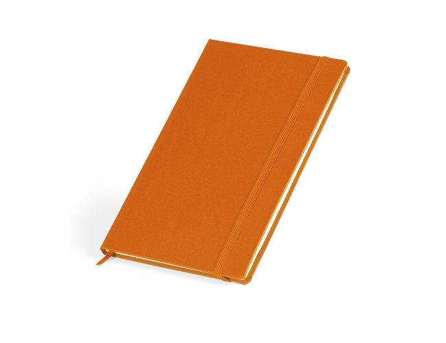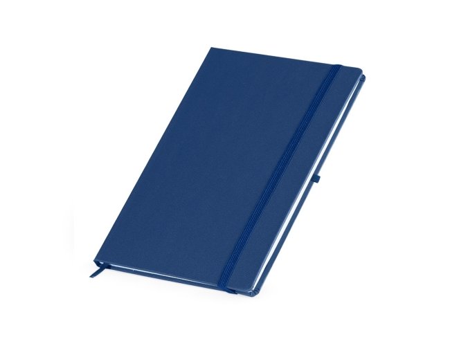 Caderneta em percalux com porta caneta, marcador de página em cetim e fita elástica para fechar. Contém aproximadamente 80 folhas com pauta.
