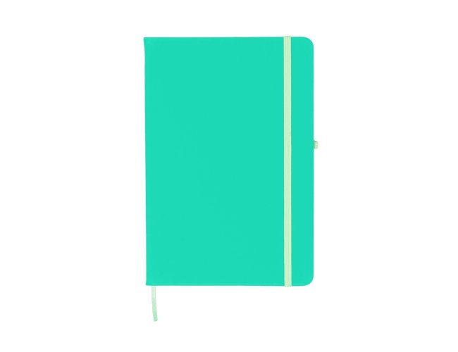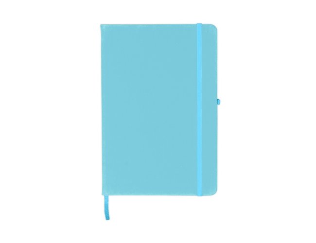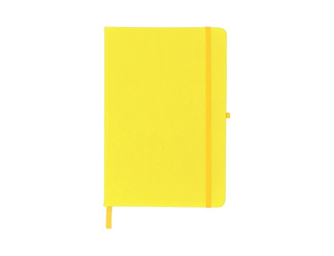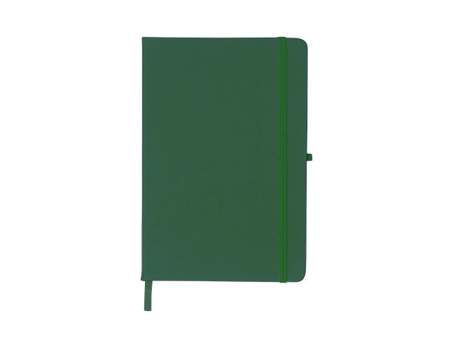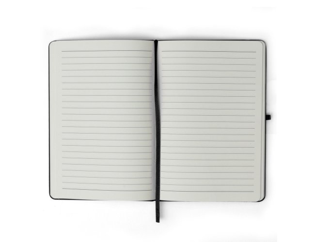 Caderneta emborrachada com porta caneta elástico em nylon, marcador de página em cetim e fita elástica de nylon para fechar. Contém aproximadamente 80 folhas pardas pautadas.