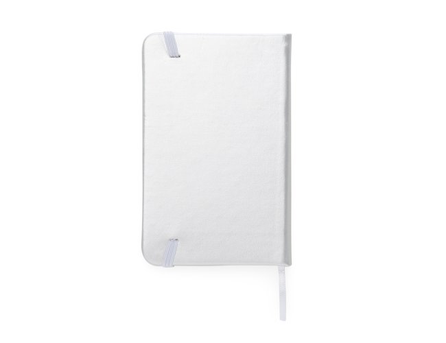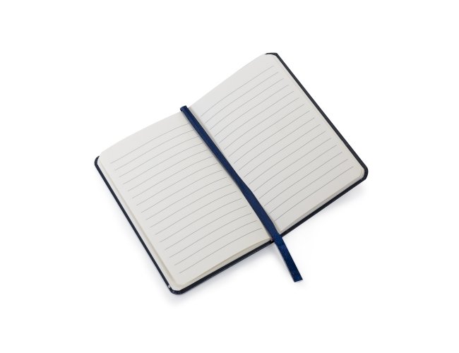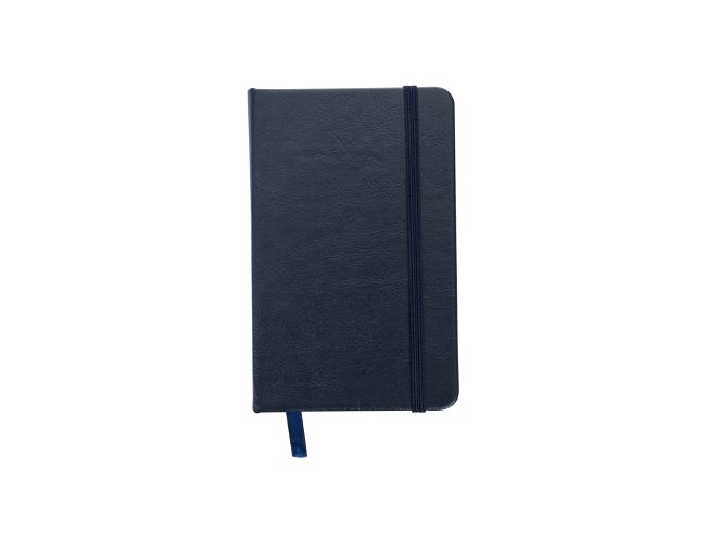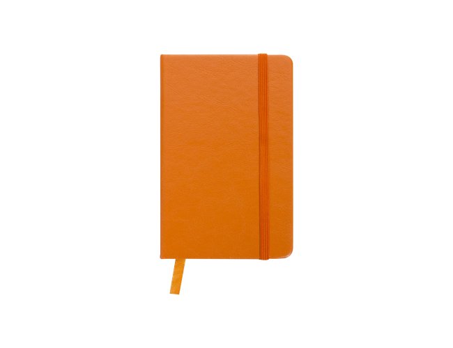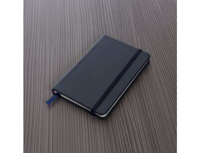 Caderneta tipo moleskine em couro sintético de frente e verso liso, marcador de página em cetim e fita elástica para fechar. Contém aproximadamente 80 folhas amarelas pautadas.