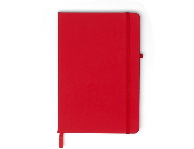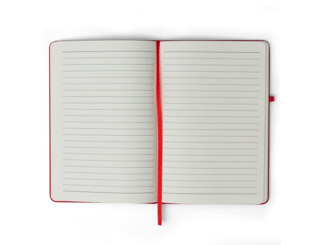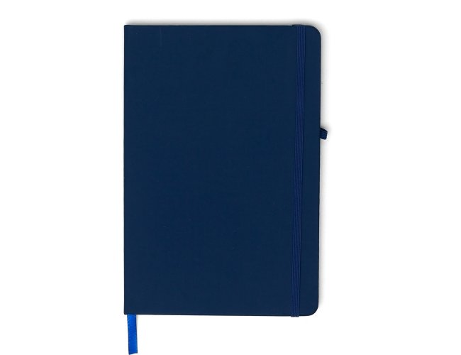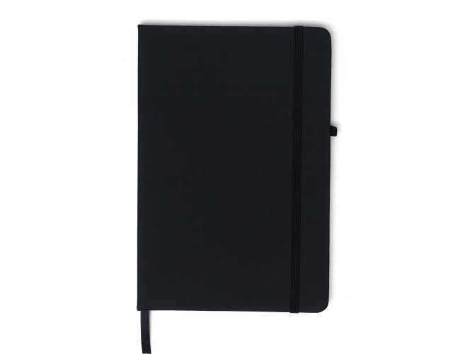 Caderneta tipo moleskine emborrachado com porta caneta elástico em nylon, marcador de página em cetim e fita elástica de nylon para fechar. Contém aproximadamente 72 folhas pardas pautadas.
