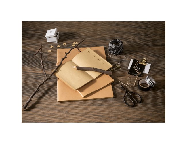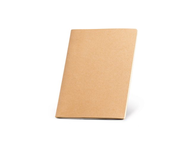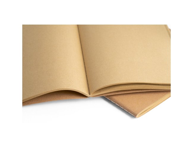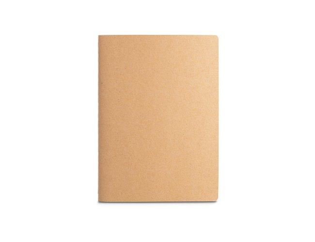 Caderno A4 com capa em cartão (250 g/m²) e cantos redondos. Contém 80 folhas não pautadas, costuradas, em papel reciclado proveniente de gestão florestal