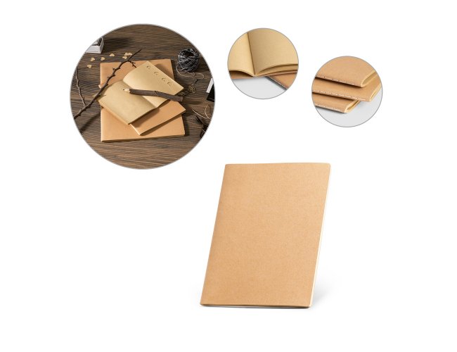 Caderno A5 com capa em cartão (250 g/m²) e cantos redondos. Contém 80 folhas não pautadas, costuradas, em papel reciclado proveniente de gestão florestal sustentável.