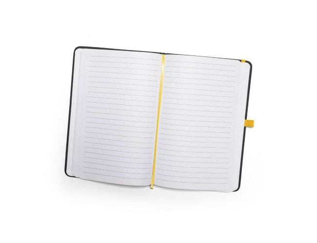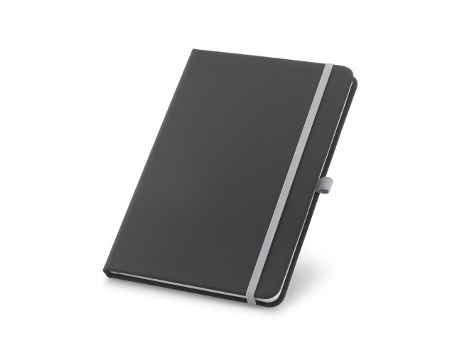 Caderno A5 em c. sintético com capa dura. Contém 80 folhas pautadas, fita separadora, elástico e suporte para esferográfica (não inclusa). 140 x 210 mm.