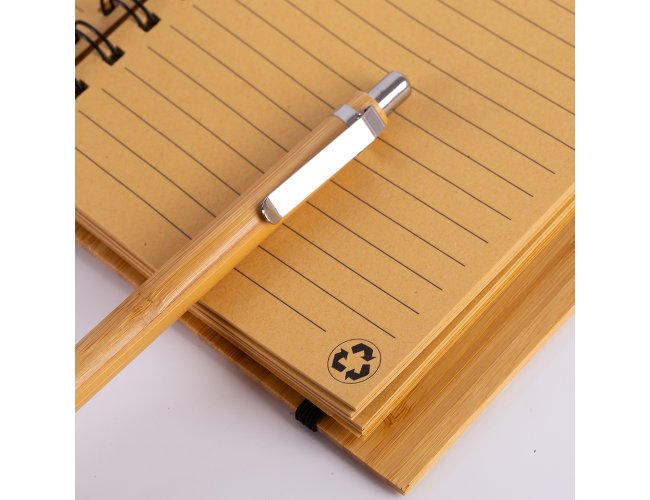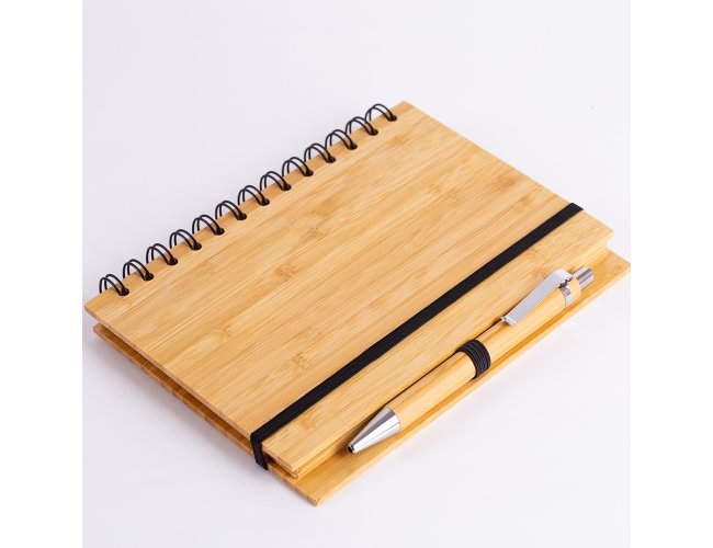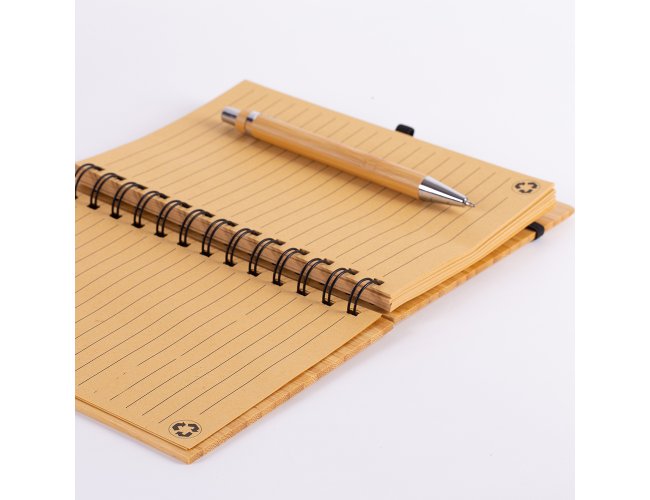 1 Caderno de anotações 18x13,5cm capa de bambu, com elástico, suporte para canetas e miolo com 70 folhas pautadas na cor bege;