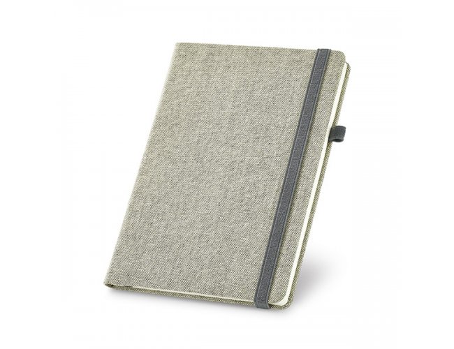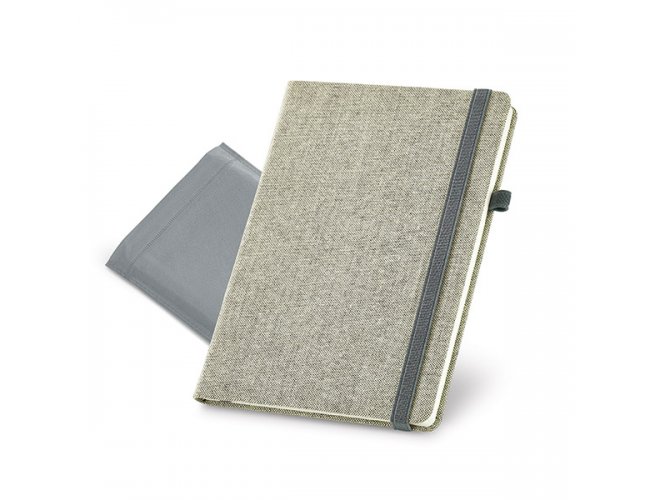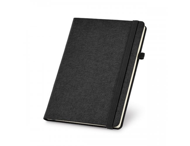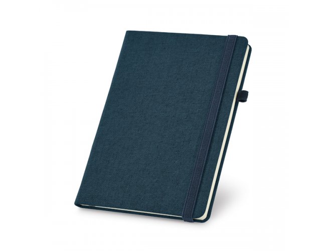 Caderno capa dura. Algodão cavas sintético. Com porta esferográfica e 96 folhas não pautadas cor marfim. Fornecido em embalagem de non-woven. 148 x 210 mm | Embalagem: 185 x 240 mm
