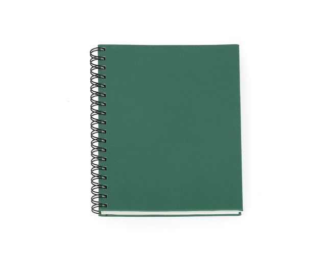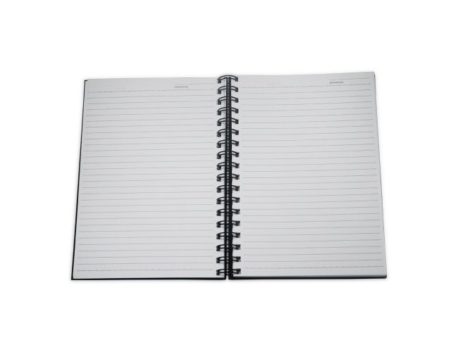 Caderno emborrachado de frente e verso lisa com espiral preto. Possui dados pessoais, calendário de 2023 à 2025, aproximadamente 100 folhas brancas pautadas com detalhe "data" na parte superior de cada folha.