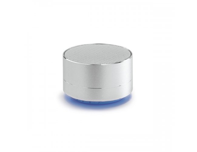 Caixa de som com microfone. Alumínio. Com transmissão por bluetooth e leitor de cartões TF. Com 3W/4Ω. Autonomia até 5 h. Função para atender chamadas, controle de volume, conexão à playlist do dispositivo móvel e rádio FM. Incluso cabo micro USB para carregar. Fornecida em caixa presente. ø71 x 42 mm | Caixa: 80 x 80 x 60 mm