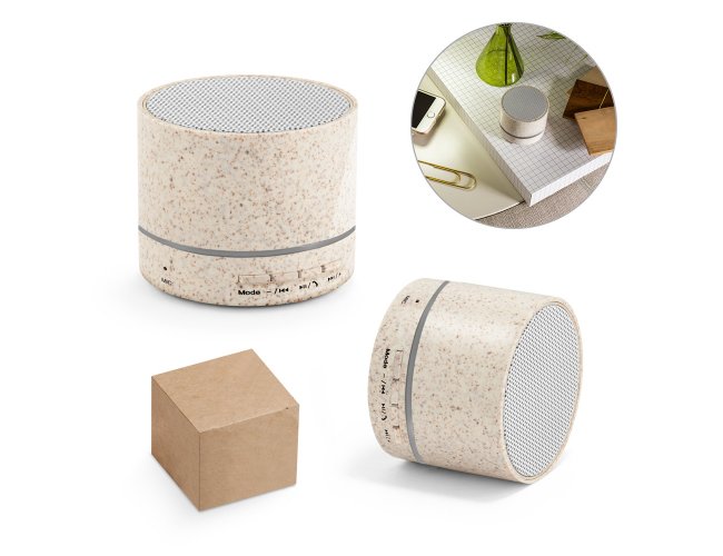 Caixa de som portátil em fibra de palha de trigo e ABS com microfone. Potência de 3W e transmissão por bluetooth 5.0. Com tempo de reprodução de 2 horas e uma bateria de 300 mAh. Incluso cabo micro USB. Fornecido em caixa presente de papel craft. ø62 x 48 mm.