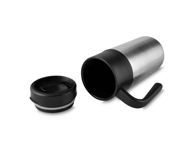 Caneca em aço inox de 350ml com tampa plástica. Tampa com anel de silicone antivazamento. Bico com trava de vedação.