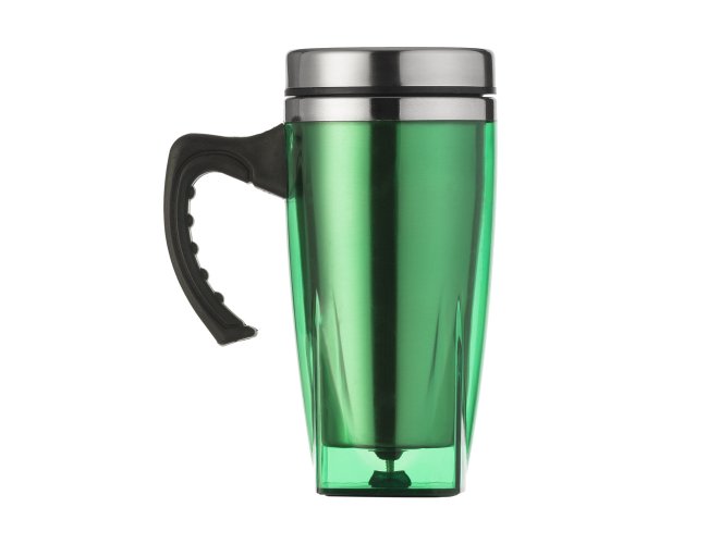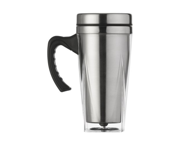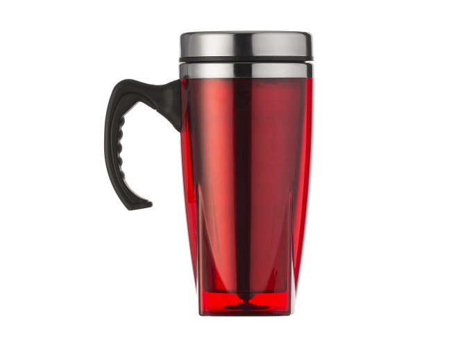 Caneca acrílica 450ml com fundo quadrangular com cabo plástico resistente, detalhes na tampa e compartimento interno de inox. Tampa rosqueável, possui compartimento que pode ser aberto para beber(não é térmica).