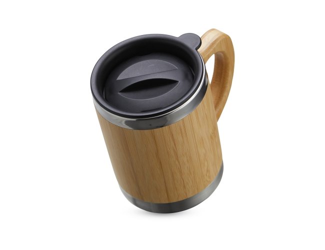 Caneca de bambu com capacidade de 300ml. Contém tampa plástica com bocal e trava de segurança.