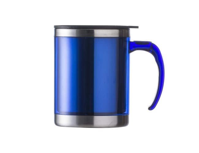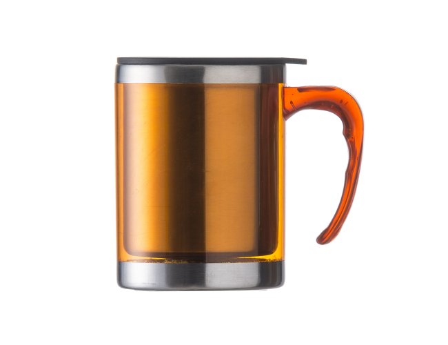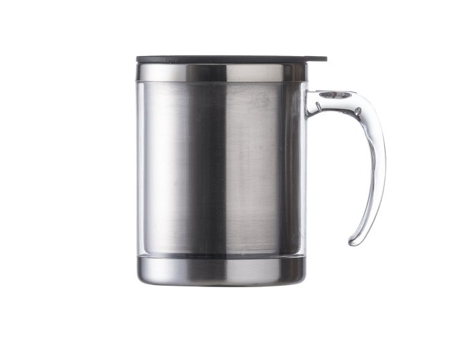 Caneca acrílica 400ml com detalhe oval no pegador, revestimento interno e detalhes em inox. Tampa plástica resistente com sistema giratório para abertura(não é térmica).