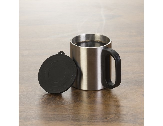 Caneca de inox 180ml com cabo e tampa em plástico resistente(não é térmica). Personalizada com a sua logomarca.