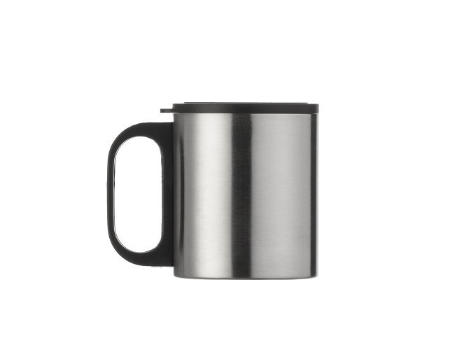 Caneca de inox 180ml com cabo e tampa em plástico resistente(não é térmica).