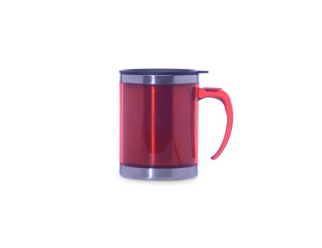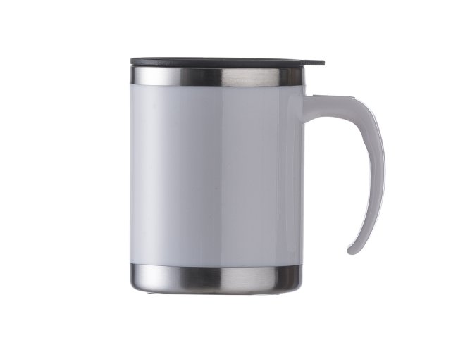 Caneca acrílica 400ml com detalhe oval no pegador, revestimento interno e detalhes em inox. Tampa plástica resistente com sistema giratório para abertura(não é térmica).