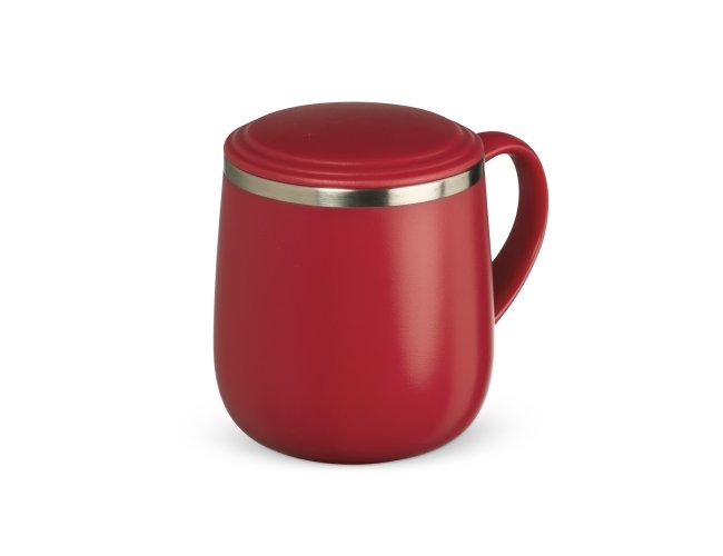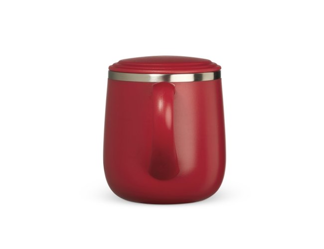 Caneca 370ml parede dupla em Inox, com pegador de plástico, contém tampa plástica para vedação e base com EVA antiderrapante.