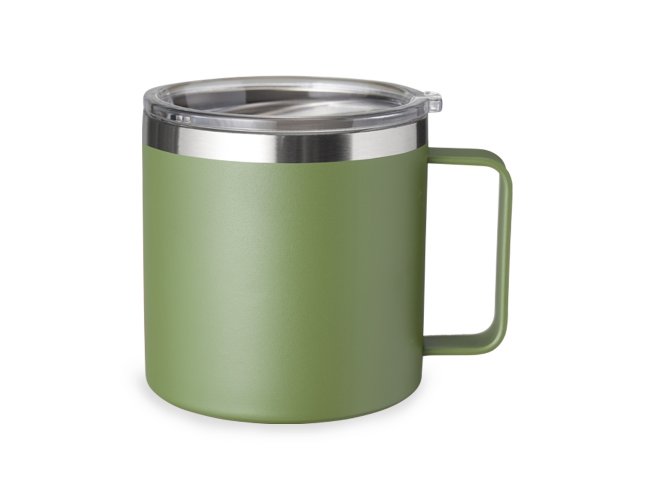 Caneca térmica de inox 450ml com parede dupla e tampa com acesso ao bocal.
