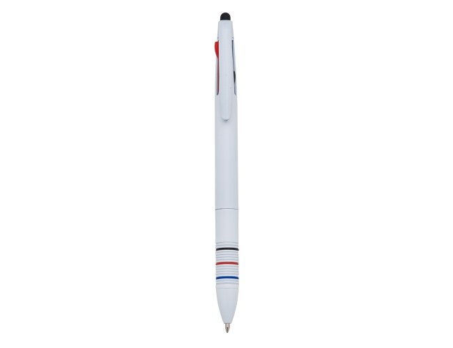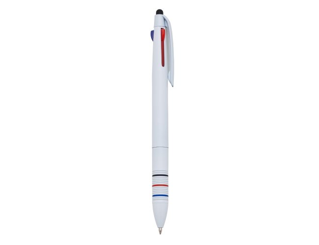 Caneta plástica três cores e ponteira touch, corpo branco com detalhes coloridos. Possui as cargas azul, preto e vermelho(basta descer o suporte colorido pra acionar a cor). Clip plástico e touch superior, possui anéis preto, vermelho e azul na parte inferior em relevo.