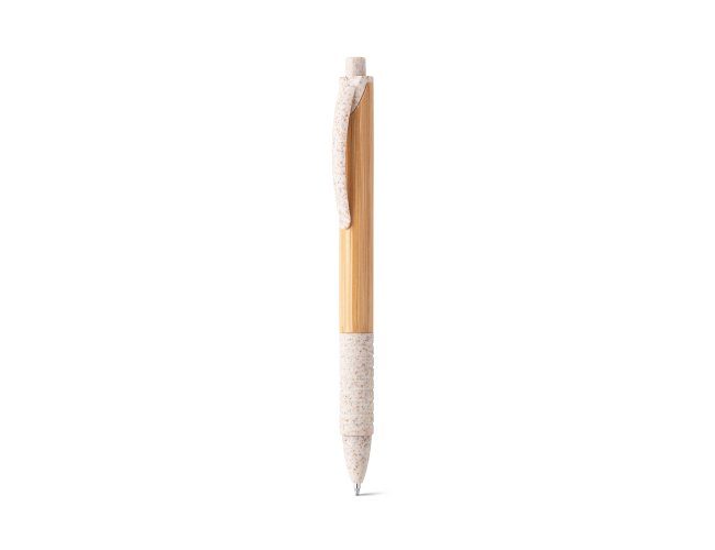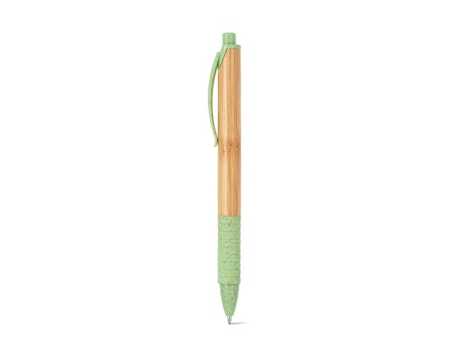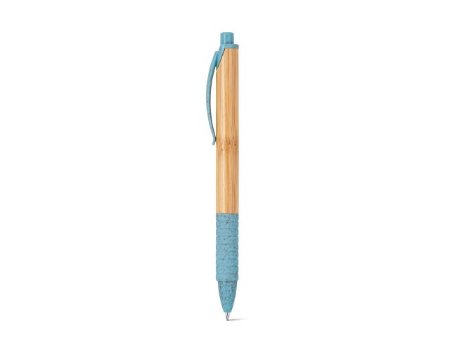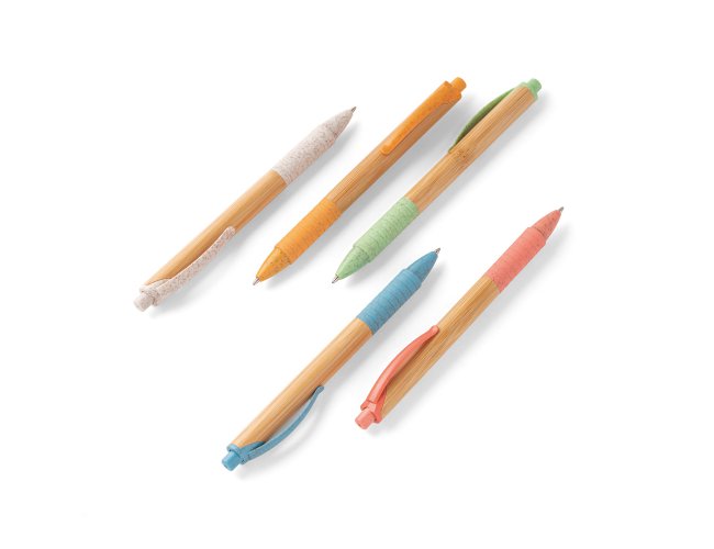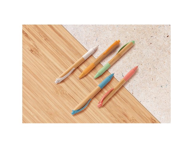 Esferográfica em bambu com clipe, antideslizante e elementos coloridos em fibra de trigo e ABS. Até 1,5 km de escrita. ø11 x 142 mm