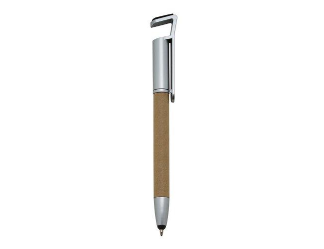 Caneta ecológica touch com suporte para celular, corpo de papelão e detalhes em plástico. Clip aberto utilizado como suporte para o celular e parte superior com limpador de tela. Aciona por giro, carga esferográfica na cor azul.