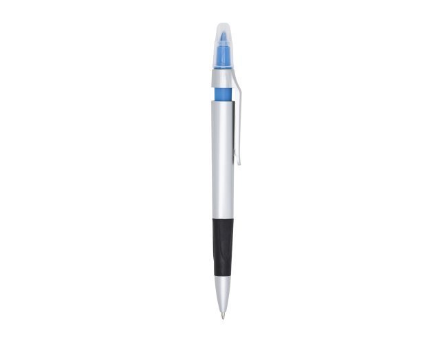 Caneta plástica esferográfica e marca texto com corpo prata. Possui tampa protetora no marca texto e detalhe emborrachado com relevo na parte inferior. Aciona por clique.