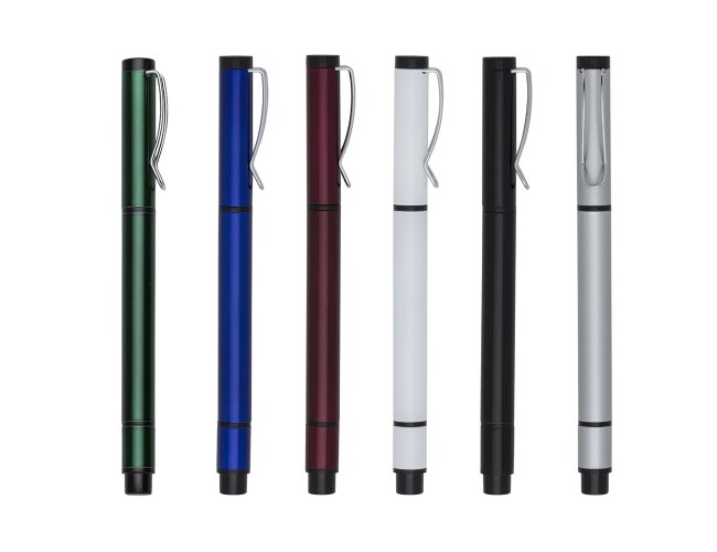 Caneta metal marca texto inteira colorida com detalhes preto. Clip de metal na cor prata, possui tampa em ambos lados(esferográfica e marca texto). Marca texto apenas amarelo. Tamanho total aproximado (CxD): 13,9 cm x 1,3 cm. Peso aproximado (g): 17