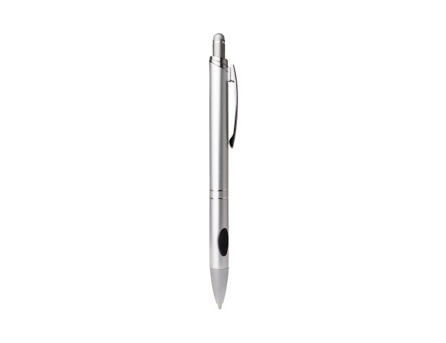 Caneta metálica com touchscreen, com detalhe emborrachado na parte inferior, carga esferográfica azul de 1.0 mm e acionamento por clique.