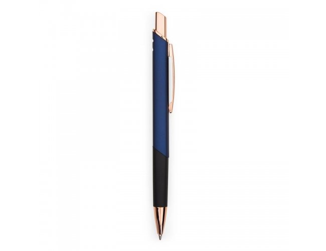 Caneta feita inteiramente em metal com acionamento por clique e carga esferográfica azul de 1,0mm.