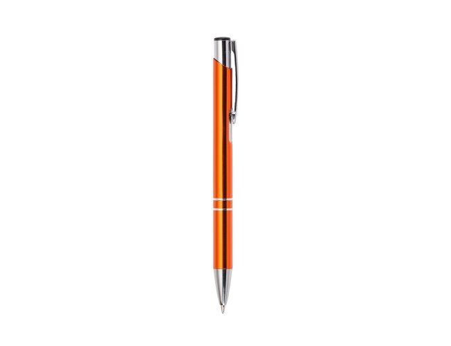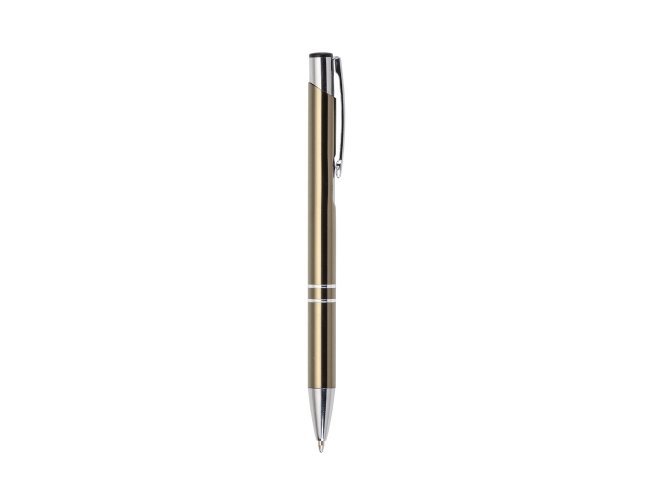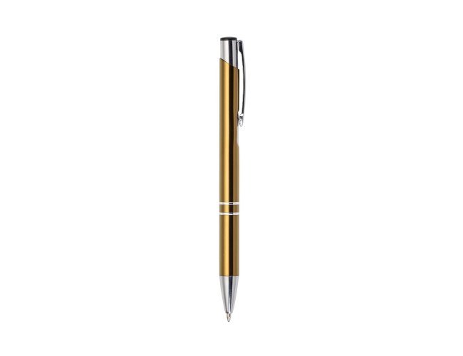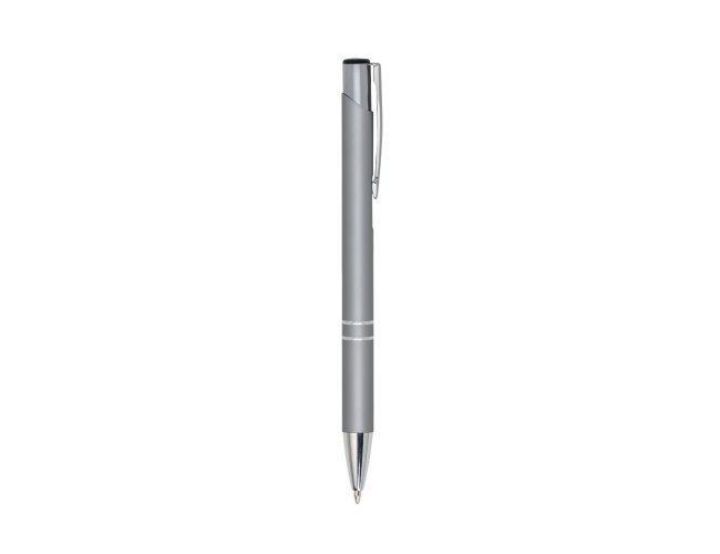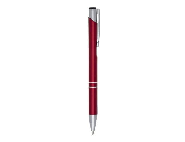 Caneta metal inteira colorida com detalhes prata. Clip metal com a ponta do acionador preto, parte inferior com dois anéis prata. Aciona por clique.