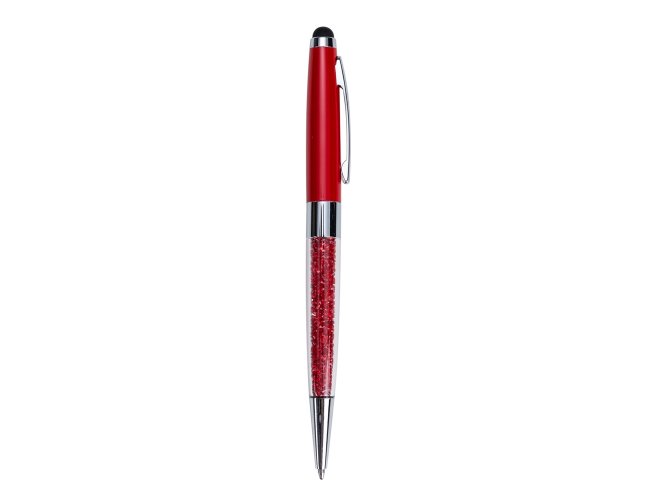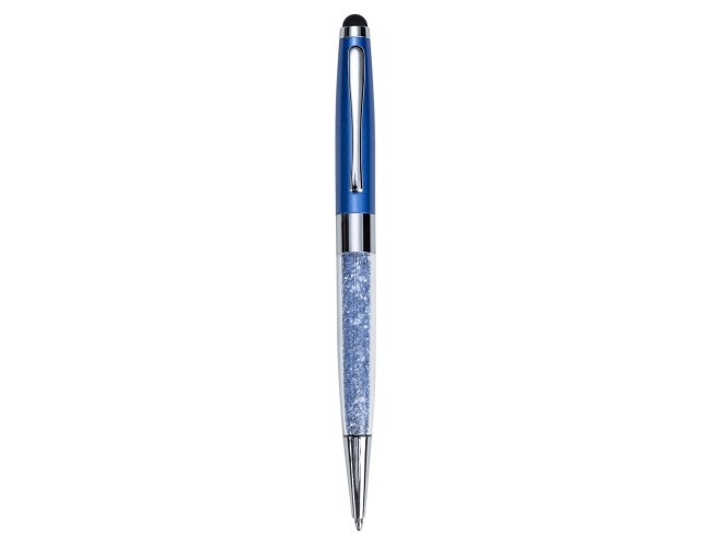 Caneta metal touch, parte inferior em plástico transparente com cristais(swarovski) interno. Clip metal e ponteira touch superior, cristal da mesma cor que o detalhe colorido da parte inferior. Aciona por giro. Personalizada com a sua logomarca. Tamanho total aproximado (CxD): 14,4 cm x 1,3 cm. Peso aproximado (g): 13