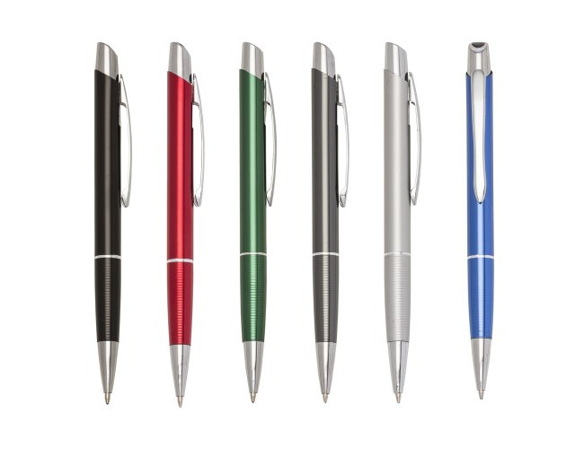 Caneta metal inteira colorida com detalhes prata. Clip metal com detalhe preto no acionador, possui um anel prata inferior e trinta e um anéis em relevo(na mesma cor da caneta)clique.