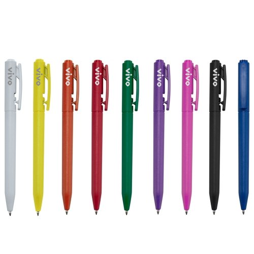 Caneta plástica inteira colorida com pintura fosca. Anel central e acionador em relevo. Aciona por clique e para destravar basta apertar a parte inferior do clip.