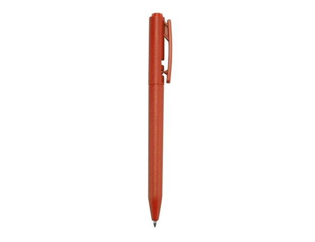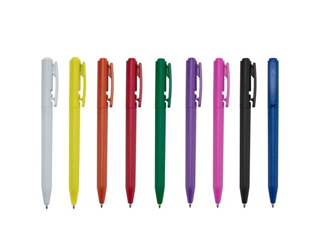 Caneta plástica inteira colorida com pintura fosca. Anel central e acionador em relevo. Aciona por clique e para destravar basta apertar a parte inferior do clip.