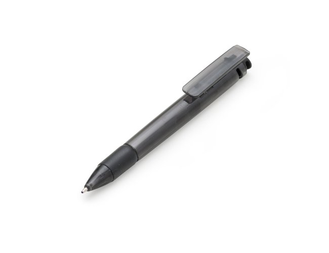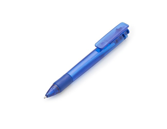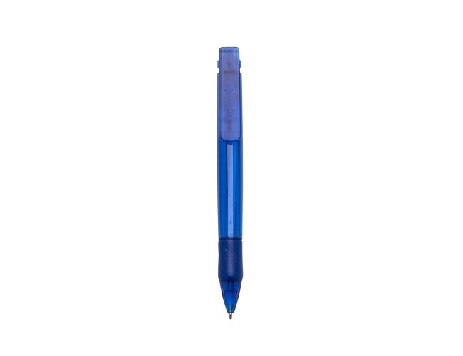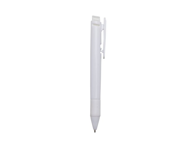 Caneta plástica inteira colorida com detalhe emborrachado. Possui dois traços vazados na parte superior e acionador com detalhes em relevo. Aciona por clique, para destravar bastar pressionar o clip.