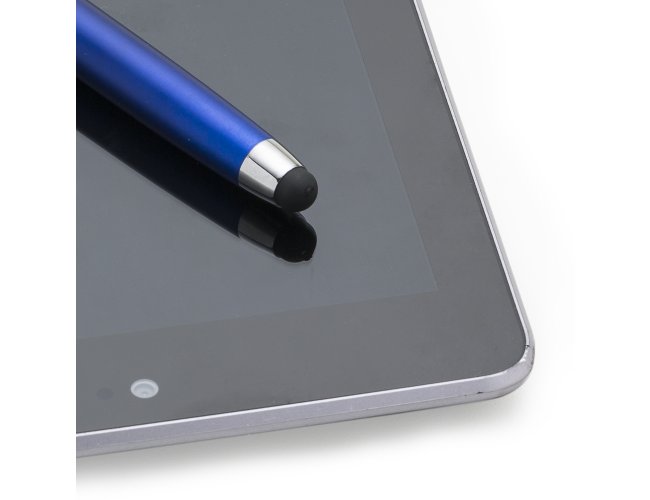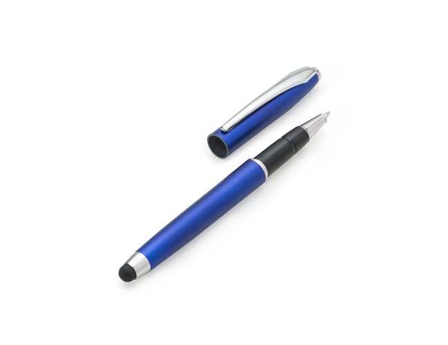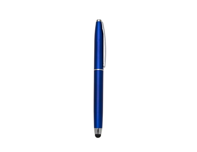 Caneta plástica touch inteira colorida com detalhes em prata. Possui tampa e clip de metal, anéis: superior, central e inferior em prata. Para utilizar esferográfica basta tirar a tampa, touch fica do lado oposto.