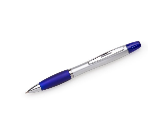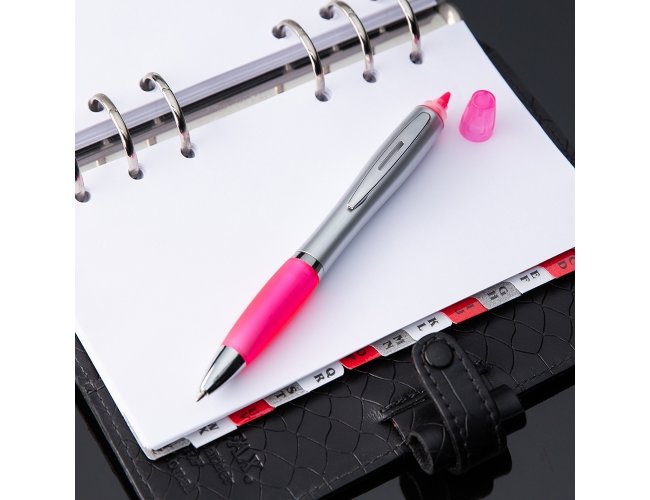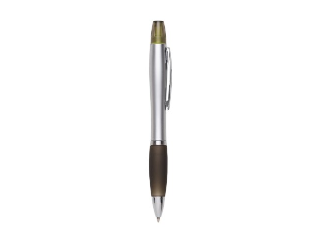 Caneta plástica com marca texto, corpo prata com anel inferior e detalhe emborrachado colorido. Clip metálico com detalhe vazado no centro, possui tampa plástica para o marca texto. Aciona por giro.