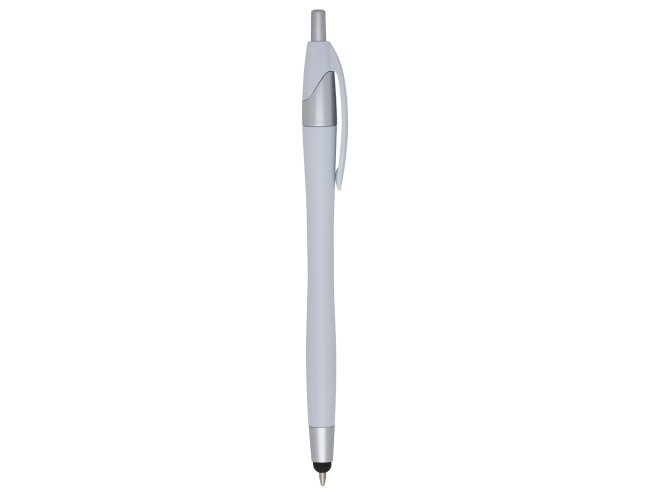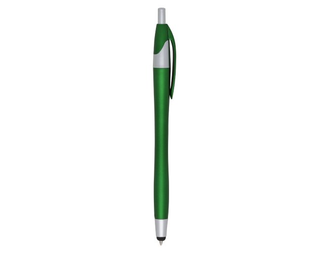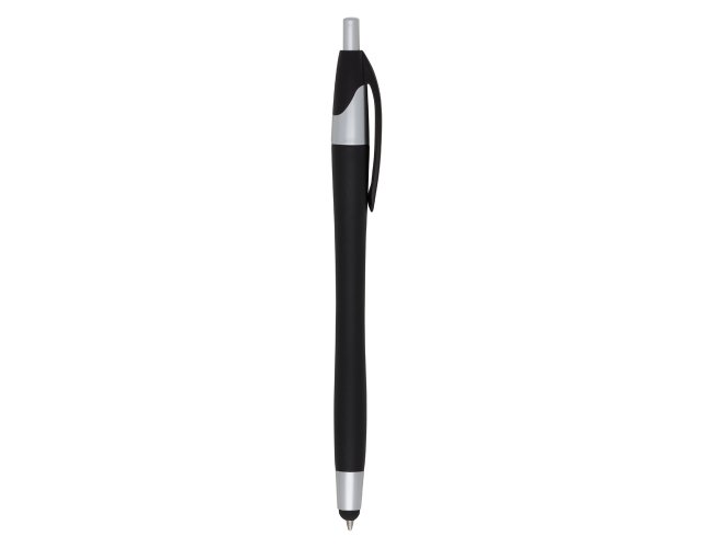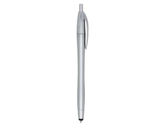 Caneta Plástica com Ponteira Touch 12638, inteira colorida com detalhes prata. Aciona por clique, ponteira sai através da borracha touch.